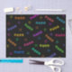 A pattern for cat lovers featuring the word "meow" written with a paw print font in a rainbow of colours on a black background. Cute, colourful kitty faces complete the design. The back is solid black but can be changed to any colour with the design tool.