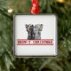 Two cats with holiday stocking caps and text that reads "Meow-y Christmas" on Christmas keepsake ornaments that you can choose the shape of before ordering!