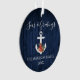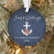 Script de calligraphie élégant Mer nautique et salutations Marine Ornement bleu. Ancre surmontée d'aquarelle florale y compris poinsettias rouges, cônes de pin et autres belles verdure d'hiver. Impression en bois bleu.