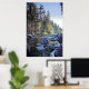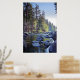 This photo features the smoothed out water of Merced River, boulders and pine forest, with El Capitan in distance, in Yosemite National Park.