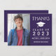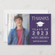 Ce carte de remerciements de graduation photo personnalisé comporte une photo à gauche et à droite un design typographique de texte blanc sur violet accentué par une casquette de graduation. Ajoutez un message de remerciement au verso de la carte et la signature ou supprimez-la. Conçu par l'artiste Susan Coffey.