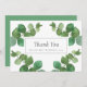 Des feuilles d'eucalyptus vert frais encadrent votre mariage merci avec votre nom de famille ensemble dans la typographie classique élégante. L'inverse a un message de remerciement que vous pouvez personnaliser.