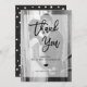 Cette carte de remerciements mariage moderne et élégante dispose de votre propre photo couvrant entièrement l'arrière - plan. Une superposition en blanc clair présente une typographie de script noir tendance.