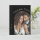 Vos invités mariages seront si heureux de recevoir ce carte de remerciements de mariage magnifiquement élégant en noir avec une photo spéciale de votre jour de mariage. Simple, élégant et de bon goût, ce design classique présente une fine bordure le long du bord gauche avec l'initiale monogramme du marié et du marié. Jolie lettrage serif épelle le Merci en texte incurvé au-dessus du modèle photo d'arc. Remplacez l'exemple de photo par la photo sélectionnée. Le verso de la carte contient un modèle texte avec un exemple de message de remerciement que vous pouvez utiliser comme écrit, ou personnaliser avec votre propre libellé, avec les noms de la mariée et du marié.