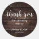 Merci pour célébrer avec nous Mariage Sticker, en calligraphie de script rustique, soirée cottage, arrière - plan en bois foncé.