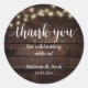 Merci pour fêter avec nous Mariage Sticker, en calligraphie de script rustique, phares à cordes de cottage, arrière - plan en bois foncé.