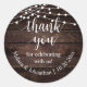 Merci pour fêter avec nous Mariage Sticker, en calligraphie de script rustique, lumières à cordes de soirée cottage, arrière - plan de bois brun foncé.