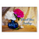 Les roses dans un vase disent merci à un chéri. OEuvre d'origine montrant deux roses dans un vase bleu avec des tiges de rosebuds allongés sur la table.