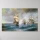 Romantic style poil painting from 1892 by Ivan Aivazovsky, depicting the ship Mercury attacked by two Trukish battleships.