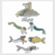 This illustration features an array of merfolk from around the world. The merbeings depicted include: a blonde-haired northern European mermaid, a red-capped male merrow of Irish lore, a blue-skinned Danish havmand, a necklace-wearing bonito maiden from the traditions of the Sa'a people of the Solomon Islands, a human-faced Japanese ningyo, and a red-eyed kaaiman of South Africa.