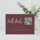 Modern minimalist wedding RSVP card featuring boho script font at the top with a QR code. This simple design will work for any season. Merlot red background with white texts.