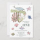 A watercolor and illustrated mermaid themed 1st birthday party invitation. Mermaid and crab with creatures of the sea surrounding her. A cute artistic whimsical style invite.