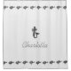 A stylistic mermaid is centred. On top and bottom there is a line of swimming fish, coloured grey. Default name "Charlotta" can easily be customized. Solid background colour can be replaced, too.