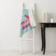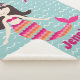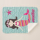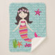 This adorable mermaid throw features a brunette mermaid with multi-coloured shell striped pattern tail in orange, fuchsia, light pink, and aqua. She is wearing a dark pink bikini top and has a pink floral headband on. She is swimming in a sea of aqua blue and white waves, with pink and orange starfish and seaweed accents. The sherpa throw is also personalized with a name that can be removed or changed to say whatever you want.