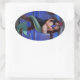A mermaid finds her pirate in this romantic fantasy encounter under the full moon on a dark Caribbean beach. This oval sticker is reproduced form an original painting by Sue Halstenberg.