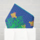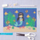 This beautiful birthday pool party tissue paper features a mermaid with dark hair in ponytails swimming in the ocean with her sea creature friends. Some graphics by AMBillustrations.