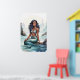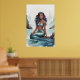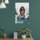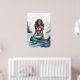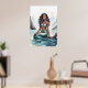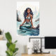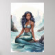 Poster of a mermaid with long, flowing hair sitting gracefully atop a rock surrounded by calm ocean waves. Towering rock formations loom in the misty background, creating a serene and mystical atmosphere.