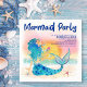 Whimsical, sea themed bridal shower invitation features a watercolor mermaid lounging on the beach, enjoying the sunset and a tropical drink with a "Mermaid Party" caption in violet blue brushstroke style lettering. Art by KL Stock