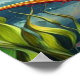 abstract oil painted look with a picture of a a mermaid topical fin in red and green top sitting on a rock with the ocean and five other colourful topical fish and whales and seals around her with a blue sky.green seaweed floating . This design features brilliant gold lightning colours and powerful pose .with paint drips on it