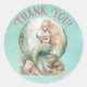 Mermaid Thank You Classic Round Stickers - A beautiful, long fair-haired mermaid, pale pink flowers in her hair and on her body, her tail is made up with green and gold scales, glistening in the sparkly sea. She is sitting on a rock, holding a large green and white orb. What's inside? Could be a pearl, some gold or some other mysterious treasure. A pretty sticker for envelopes or to seal a gift bag.