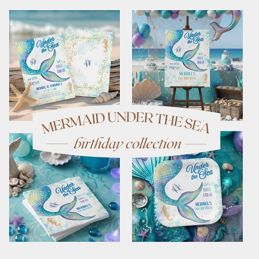 Add a touch of ocean enchantment to your celebration with these Mermaid Under the Sea birthday party napkins. Featuring the same dreamy watercolor artwork as the matching mermaid invitation, these napkins showcase a shimmering mermaid tail, sea-washed bubbles, soft teal and sea foam tones, splashes of purple, and sparkling gold star accents. Adorable ocean details like a cute seahorse and a tropical fish complete the magical underwater scene. Perfect for coastal birthday parties, summer pool gatherings, mermaid-themed celebrations, and any ocean-loving girl's birthday. Customize the name and age to create a coordinated, personalized party experience. Pair with the full Under the Sea Ocean Animals collection or the Mermaid Under the Sea collection for a beautifully themed event. Art by KL Stock