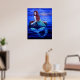 On a rock just after sunset in a dark ocean, a mermaid looks back before she starts her lobster supper. Poster reproduced form the original acrylic on canvas fantasy art painting by Sue Halstenberg.
