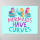 A beautiful poster for a curvy woman who embraces body positivity and loves herself at any size. Features 3 cute mermaids with purple, orange, and pink hair sitting on ocean rocks.