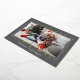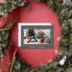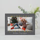 "Merriest Christmas" holiday card features a horizontal format with landscape photo and modern real gold foil greeting text that frames and overlaps the picture. Personalize the simple script text with a family signature and the year, and choose to include an additional message on the back of the card. Two additional photo spaces are also included on the back. Includes a dark charcoal grey background colour.