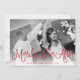 Chic holiday photo card for newlyweds features your favorite horizontal or landscape oriented wedding photo with "merrily ever after" overlaid in festive cranberry red script lettering. Personalize with your names and the year beneath. Cards reverse to a snowflake background with two additional square photos and an optional custom message to your loved ones.