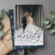 Elegant holiday photo cards for newlyweds feature a favourite vertical or portrait oriented wedding photo with "Merrily Ever After" overlaid in rich jewel toned calligraphy script. Personalize with your names or custom greeting beneath. A subtle and modern snowflake pattern on the reverse side completes the look. Perfect for sharing a wedding photo for your first married Christmas.