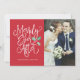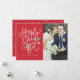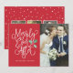 Spread love while showing off your wedding photos this holiday season with this chic and modern Just Married Holiday Photo card. Perfect for the newly married couple to use as a holiday card, wedding announcement or thank you card around the holidays season. This card highlights your wedding photo by pairing it with festive and playful script typography that says "Merrily Ever After" and accented by our hand-painted watercolor holly. The back of the card features a snowy pattern with 3 additional photos.