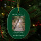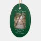 This minimalist merry and almost married holiday ornament is the perfect greeting from an engaged couple. The design features classic typography against a dark green background. Photo template via Pixabay licensed under CC0 and must be replaced with your own photo