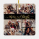 Elegant Modern Script Black and Gold 5 Photo Collage Merry and Bright Script Christmas Holiday Ceramic Ornament. Features minimalist five (5) photo collage template a pretty grid collage and „Merry and Bright” greeting text is written in a beautiful hand lettered whimsical swirly swash-tail font script in gold on black colour background. On the reverse side one photo template. This Ceramic Ornament Cute gift for your family and friends in Christmas Holiday season.