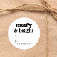 "Merry and bright." A wonderfully minimalist and modern round gift or favour sticker that enables you to personalize the design with your name in the "from" section.