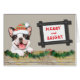 On the front of this cute Christmas card, an adorable black and white French Bulldog wears a pattern Santa hat and peers over a garland decorated wood panel fence. Beside him is a rustic wood sign that says "MERRY and BRIGHT" in red. The inside of the card has two text fields for you to customize.