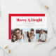A modern " Merry and Bright" 3 photo collage Christmas/ Holidays engagement announcement card. The design features bold, red and modern typography. On the rear side of the card, the design features festive bright red colour and more customizable text.