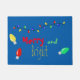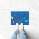 Add a fun colourful holiday greeting to your front door, with this blue mat, that reads Merry and Bright, in colourful custom text. Graphics of colourful retro style Christmas lights, decorate the top and sides of the door mat.