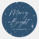 Modern holiday stickers with "Merry and Bright" displayed in a hand-lettered script encircled by a border of white stars against a navy background. Personalize the merry and bright stickers by adding your family name below. The stickers work great as envelope seals, to seal favour bags, and more!