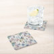 Elegant abstract snowflake pattern with Merry and Bright in chic lettering, these square paper coasters are personalized with your family name, too. Fun to add to your home decor for the holidays or give as a gift.