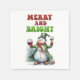 A funny and cheerful Christmas design showcases a jolly snowman dressed in a long green coat with a matching top hat, red scarf, and mittens. He holds a glass of red wine in one hand and white wine in the other. The festive red and green text reads, "Merry and bright." This design is available on a variety of products, making it a perfect gift for wine lovers.