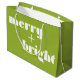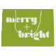 Make your holiday presents stand out with our Merry + Bright Vibrant Green Gift Bag. This large bag features the cheerful message "merry + bright" in crisp white on both the front and back. Perfect for wrapping larger gifts or multiple smaller items, this bag adds a fun and festive touch to your holiday celebrations.