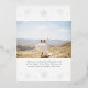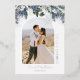 Celebrate your first holiday season as newlyweds with this elegant silver foil holiday card featuring a modern photo layout and “Merry and Married” vertical typography. Soft winter greenery with snowy pine, eucalyptus, and blue berries frames the design for a romantic seasonal look. Personalize with names and wedding date. Backside includes a coordinating snowflake pattern, an additional photo, and a custom message.