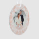 Personalize this elegant wedding newlywed keepsake holiday ornament with your favorite portrait from the wedding day (tip: crop photo to square shape before uploading). A pretty blush pink linen vintage damask pattern frames the photo and provides a decorative background to the stylish custom 'Merry and Married' monogram text on the back.