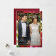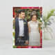 Beautiful dark burgundy red watercolor floral and greenery with elegant merry and married calligraphy Christmas holiday greeting, features the new couple's photo and their name in simple white text.