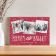 Festive holiday photo card features three square photos in a collage layout, with "merry and bright" in whimsical white lettering on a red background. Personalize with your names and the year along the bottom.