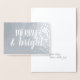 This beautiful and elegant card is perfect for all your holiday needs! The front of the card has a real silver foil background. The words "MERRY & bright" are in white, in a combination of print and script brush (brushstroke) calligraphy. Inside, the customizable message reads "may your days shine with joy" in matching silver-tone lettering.