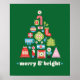 A Merry & Bright Christmas illustration for the Christmas holidays. Stylized illustrations of gifts, candy-canes, stockings, ornaments create a fun and colourful tree. Colours includes traditional Christmas colours of green and red, as well as blue, pink and light green.
