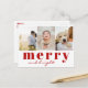 Elegant modern Christmas holiday postcard featuring three photo collage and Holiday greetings in red on the white background: Merry and bright, in a mix of classic typography and chic modern handwritten script. The reverse of the postcard contains your custom Christmas message with your last name and year. Customize this unique minimalist template by clicking on the ´´Personalize´´ button. Also available in real gold foil and other colours!