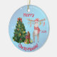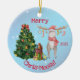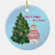 Whimsical Moose has Christmas stockings, ornaments and a clock hanging from his antlers. He's wearing a Santa hat and red and white striped scarf. Next to him is a decorated Christmas tree and Christmas gifts. It is all set against a pale blue background with snowflakes falling. Caption reads "Merry Chris-Moose! Reverse side has a Polar Bear dressed in a red and grey sweater and a red Christmas hat, standing next to a Christmas tree. This side says "And a Happy New Year" Personalize it with the year on the front and you have a festive, fun double sided Christmas ornament! This would make a great gift for a Teacher, babysitter, friends or family!