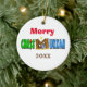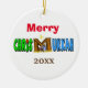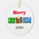 Jesus aka the Christ Child is the centre of both the Jewish and Christian religions. Therefore, I made the "M" in Chrismukkah as the manger to represent that. Customize this with the year on the front and a Name on the back if you wish.